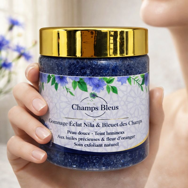 Le Gommage Éclat Nila & Bleuet des Champs – Champs Bleus est un soin exfoliant 100 % naturel formulé avec des poudres précieuses et des huiles florales pour révéler une peau plus douce, lumineuse et uniformisée dès la première utilisation.